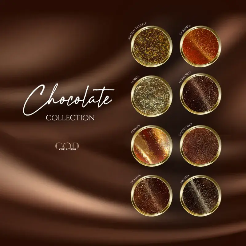 Découvrez la Chocolate Collection, un coffret exclusif de 8 vernis semi-permanents premium, soigneusement sélectionnés pour recréer toute la richesse aromatique et visuelle du chocolat.